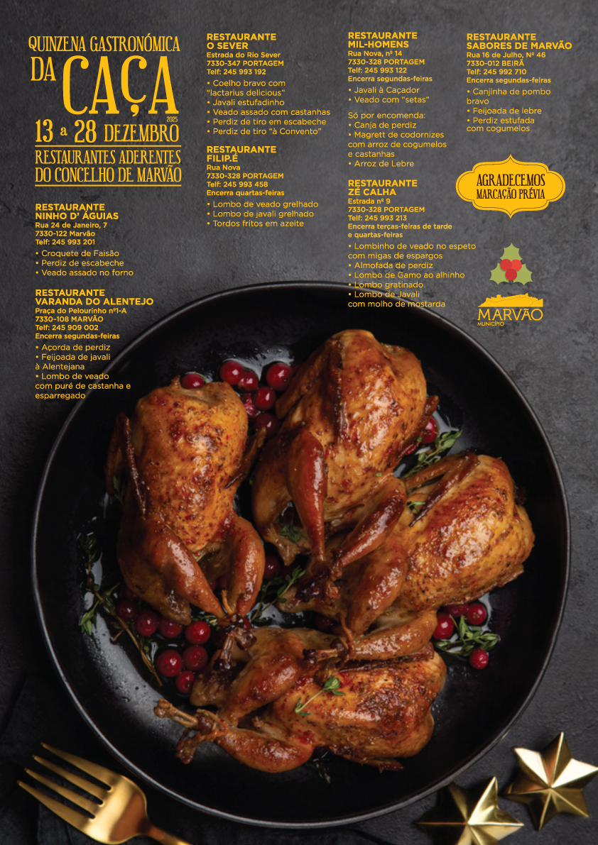 De 13 a 28 de dezembro, sete restaurantes do concelho de Marvão vão preparar os melhores pratos de javali, veado, perdiz, faisão, lebre, pombo, coelho bravo e tordo, em mais uma Quinzena Gastronómica da Caça.